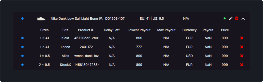 * If you’re selling 2 pairs of EU 41 on StockX, 1 pair on Alias, 1 pair on Laced, and 1 pair on Klekt, all these tasks will be grouped into **one controller** for EU 41. (As seen on the picture below)