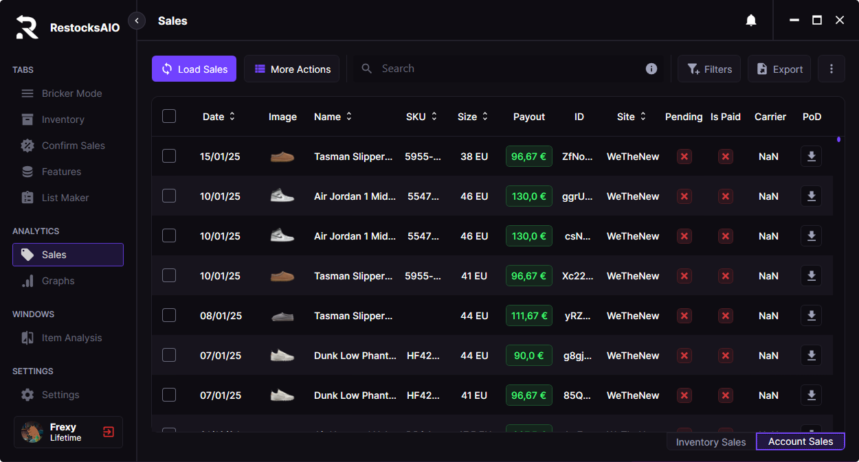 This section retrieves sales data directly from your linked accounts. By clicking **"Load Sales"**, the tool scans all connected platforms and gathers sales information.
