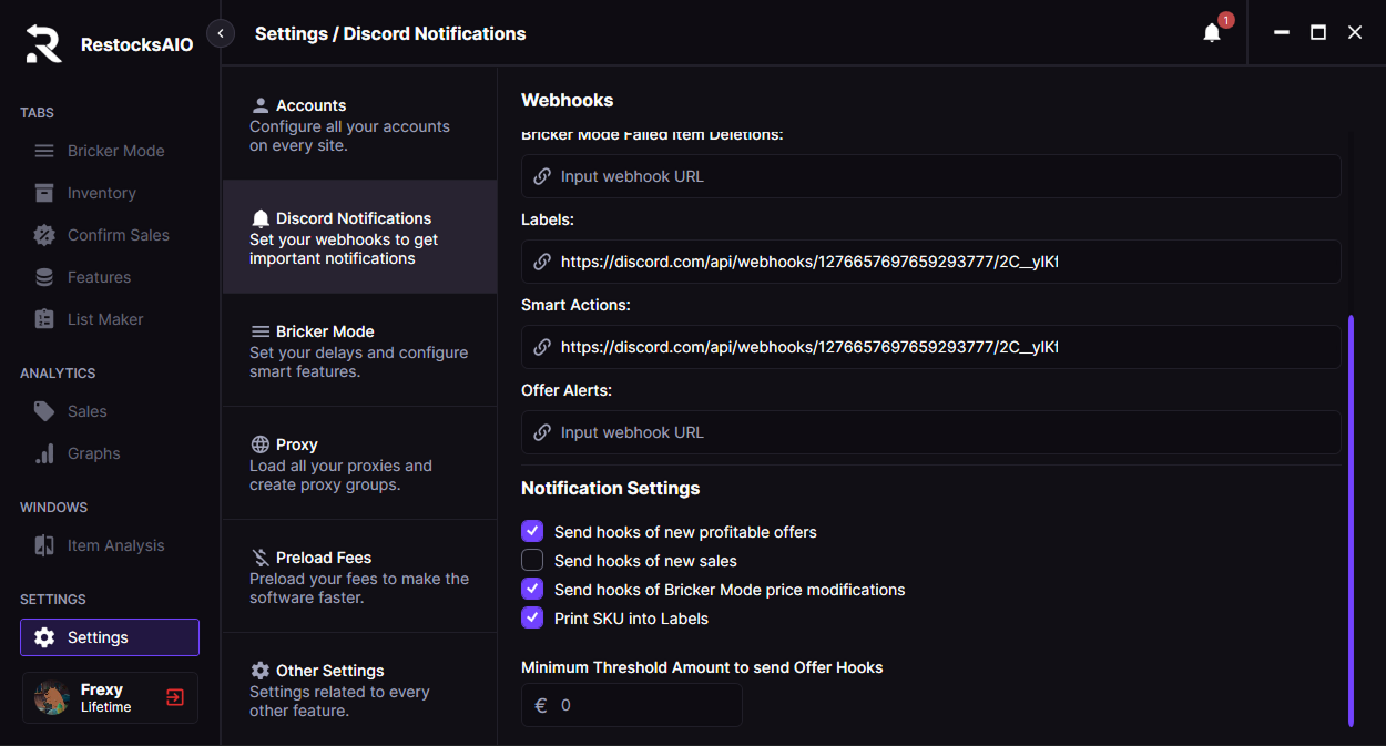 In this tab, you can set up your **Discord Webhooks** to receive real-time notifications. Stay updated on sales, download labels instantly. You may as well manage your notification preferences to suit your needs.